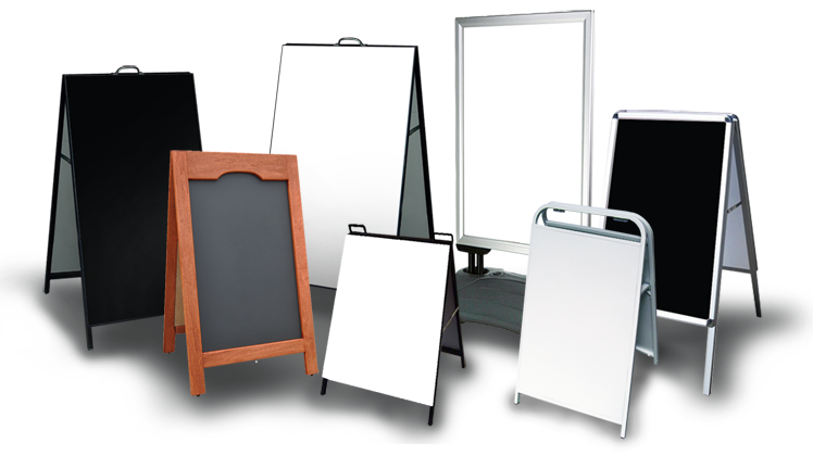 • Classic a-frame – This frame is suitable for outdoor use and comes with a small handle on the top for ease of carrying. Manufactured from 20mm steel tube with colorbond steel face and high-grade vinyl can be applied to the surface size 600 x 900mm