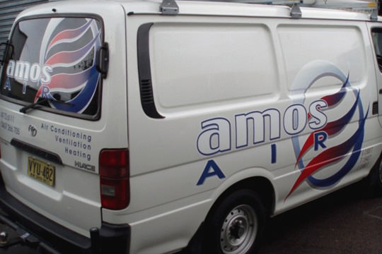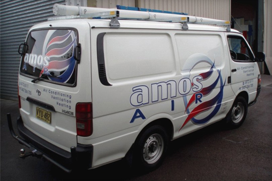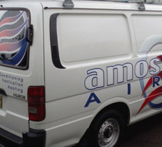 The Amos Air vans were done using digitally printed graphics and vinyl cut lettering, they had their own logos in place so it was just up to us to place them on the vans for maximum exposure.